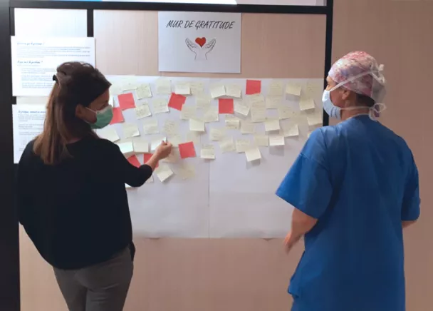 Le mur de la gratitude offre la possibilité aux médecins, soignants et à tous les collaborateurs ou encore patients de l’établissement d’exprimer par écrit leur sentiment de gratitude. Anonymes ou signés, ces petits mots mettent du baume au cœur aux équipes.