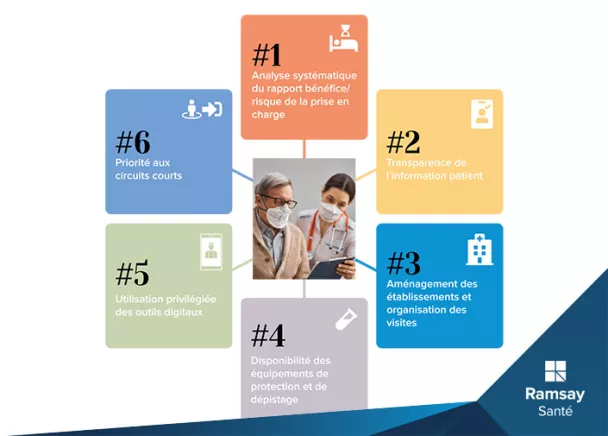 Grâce à l’engagement sans faille des médecins et des personnels soignants, Ramsay Santé a réorganisé ainsi ses activités médicales et chirurgicales de façon à sécuriser les patients, physiquement et psychologiquement, dans le contexte de l’épidémie Covid-19. Cette réorganisation prend la forme d’"engagements patients", qui s’appliquent à l’ensemble des 133 établissements Ramsay Santé en France.