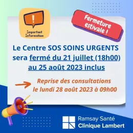 Le Centre SOS SOINS URGENTS de la Clinique LAMBERT sera fermé du vendredi 21 juillet à partir de 18h00, jusqu'au vendredi 25 août 2023 inclus.